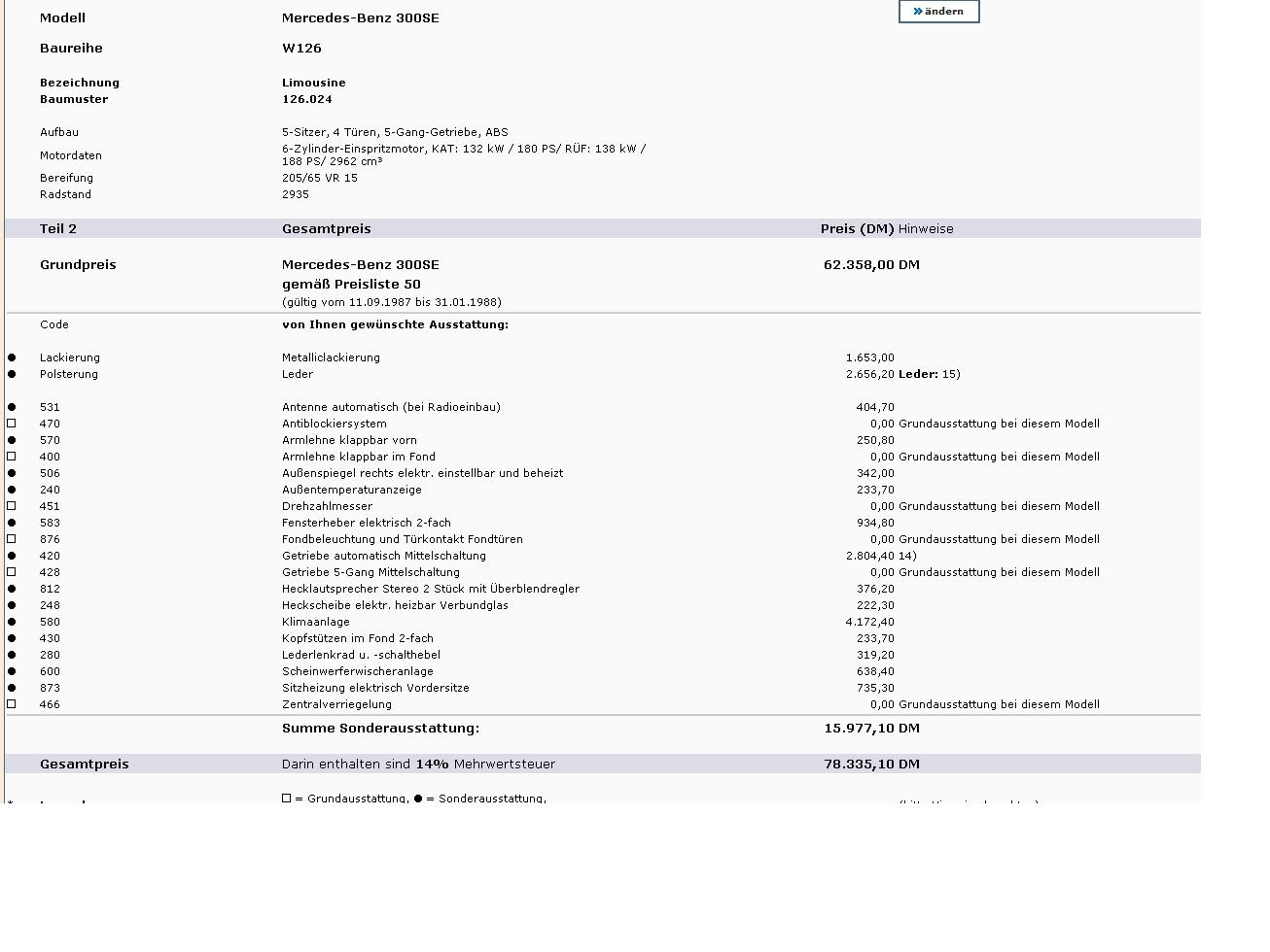 Neupreis 1987 mit sinnvoller Ausstattung